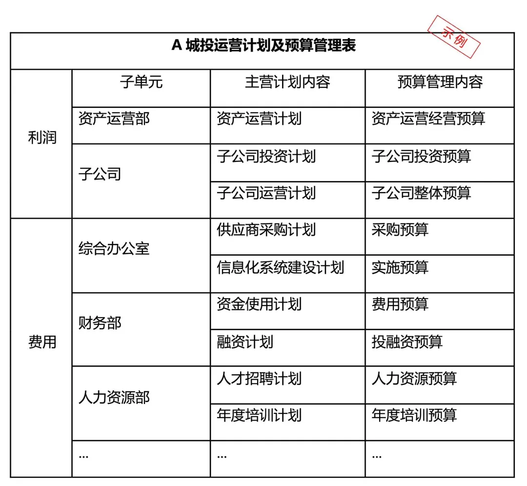 为保障行动计划落地实施,A城投需加强预算管理,通过预算管理使战略目标的实现与预算的执行一体化。进而将企业战略管理转变生产预算管理、成本预算管理、投融资预算管理等具备操作性、控制性且可考核的预算管理板块。以A城投利润及成本费用为例做预算管理如下: