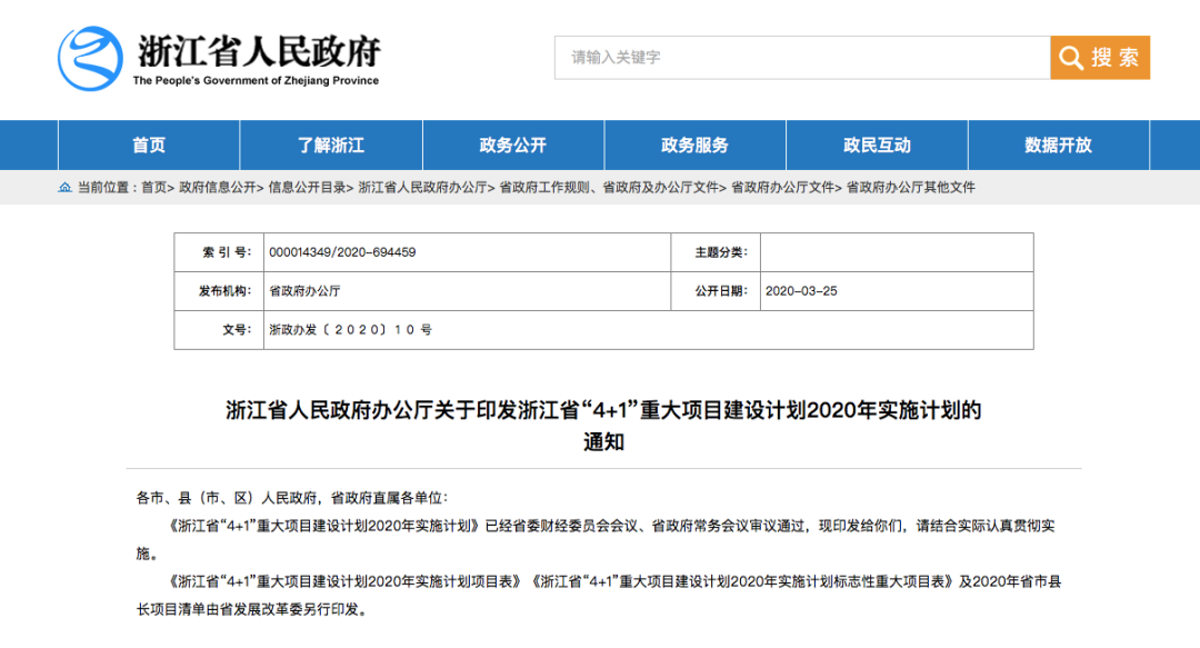 1、浙江省人民政府办公厅关于印发浙江省“4+1”重大项目建设计划2020年实施计划的通知