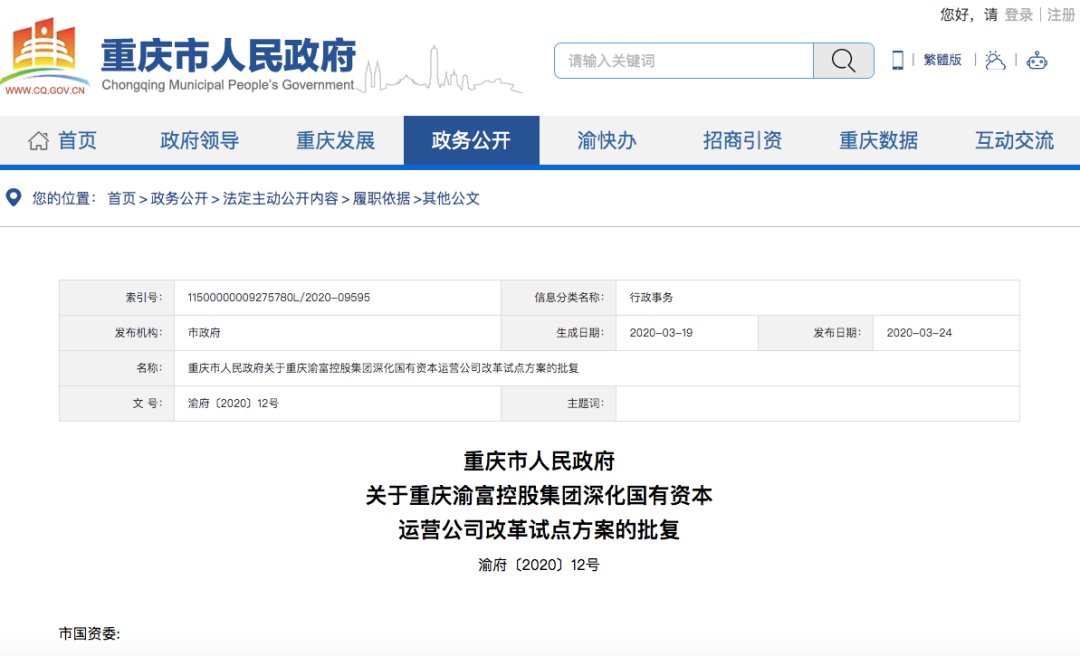 4、重庆市人民政府关于《重庆渝富控股集团深化国有资本运营公司改革试点方案》的批复