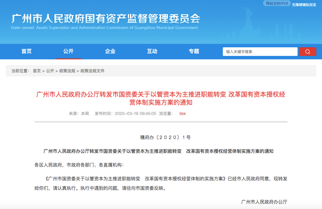 5、广州市人民政府办公厅转发市国资委关于以管资本为主推进职能转变、改革国有资本授权经营体制实施方案的通知