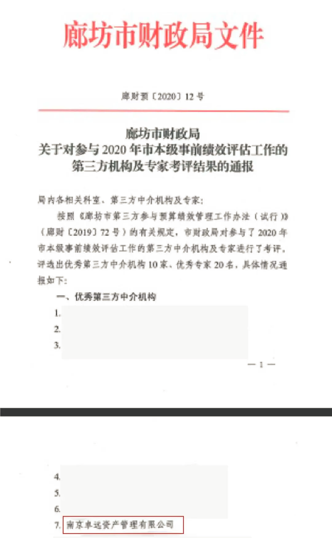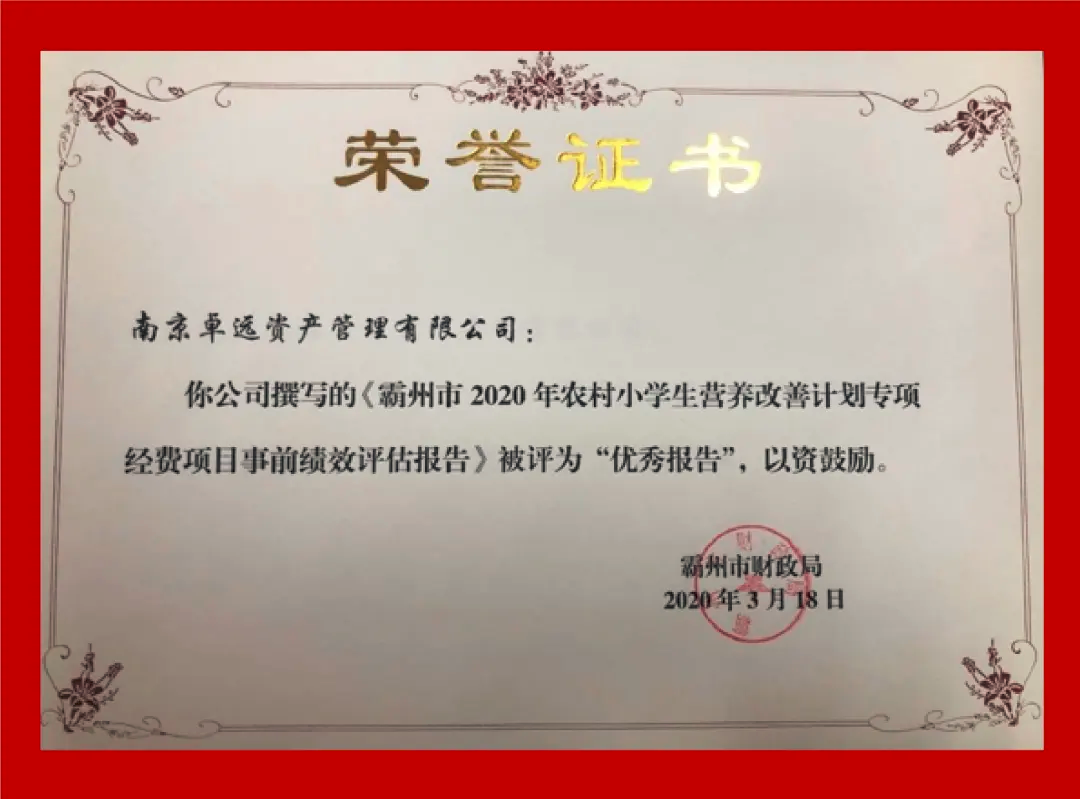 2019年10月中旬,南京卓远成功入围廊坊市财政局预算绩效管理机构库和霸州市财政局预算绩效管理机构库。作为河北地区首批预算绩效管理类项目,成功入选河北省示范区域机构库,获得业主一致好评。荣获廊坊市财政局2020年度市本级事前绩效评估工作“优秀第三方中介机构”。河北子公司团队撰写的《霸州市2020年农村小学生营养改善计划专项经费项目事前绩效评估报告》被霸州市财政局评为“优秀报告”。