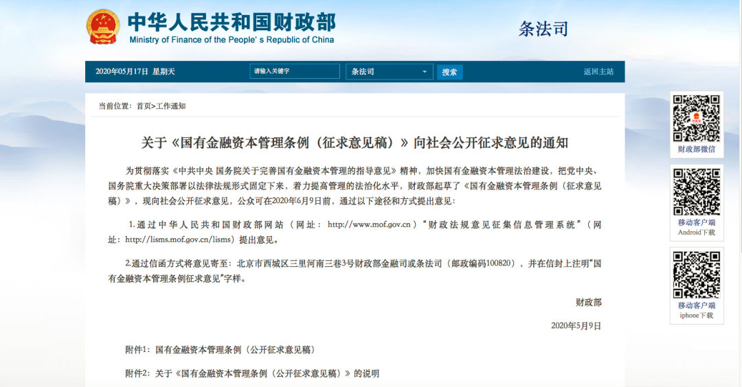1、财政部关于《国有金融资本管理条例(征求意见稿)》向社会公开征求意见的通知