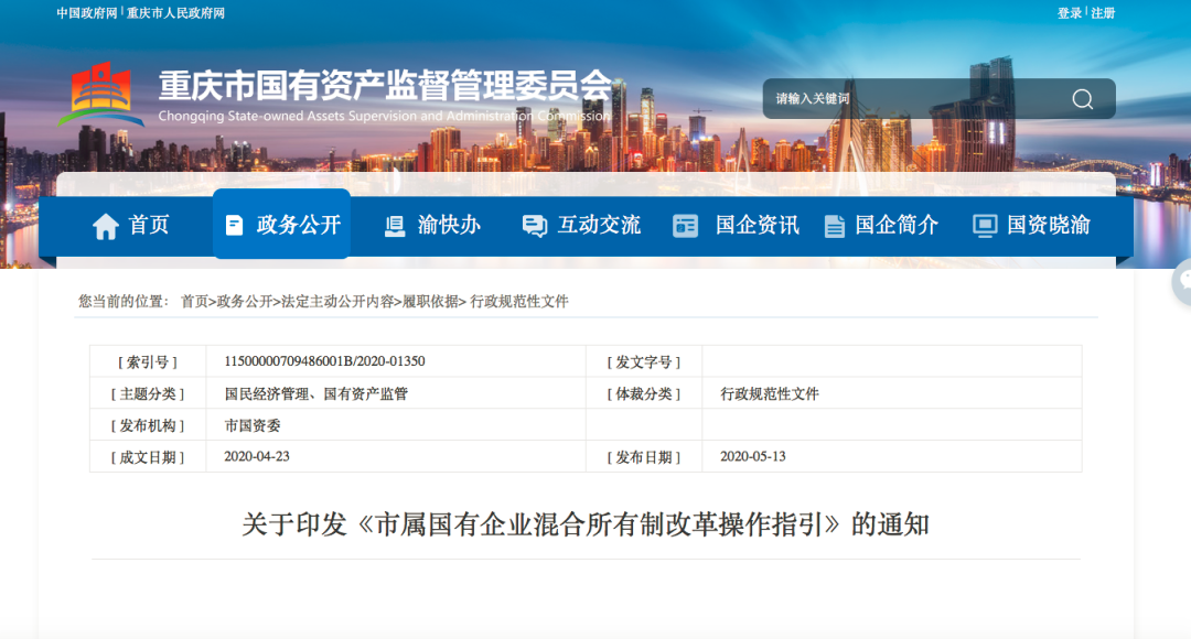 4、重庆市国资委关于印发《市属国有企业混合所有制改革操作指引》的通知 |