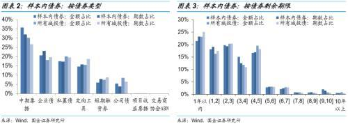 从债券类型看,和所有城投债相比,样本内城投债的中期票据占比明显更高,期数占比和存量金额占比分别为31.96%和35.69%。相对而言,样本内公司债、私募债和短期融资券的比例则较低。