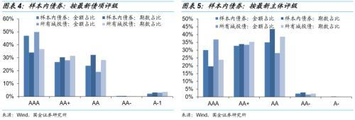 从债项评级和主体评级来看,整体上,样本内城投债的债项评级和主体评级中,中高评级的金额占比和期数占比均较所有城投债明显偏低,低评级的金额占比和期数占则高于所有城投债。