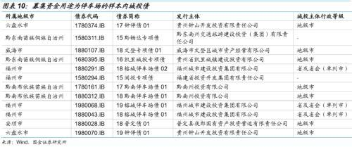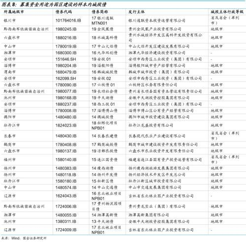 整体上,样本内城投债的募集资金去向中,最主要的一项即为借新还旧。用于借新还旧的城投债主要由中期票据、公司债、短期融资券和私募债构成。除用于借新还旧,大部分样本内企业债所募集的资金被投向了棚户区改造、园区建设等工程建设项目。各类工程建设项目中,政策推进力度较大的主要包括棚户区改造、园区建设、公路及轨道交通和停车场等。