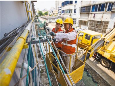 近日,在江苏省海安市海安街道一老旧小区内,供电服务人员正在对“蜘蛛网”进行线路整改。