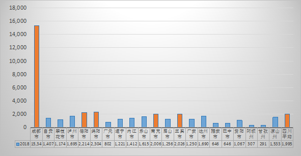 以2018年GDP为例,成都市遥遥领先于其他地市,除成都以外的20个地市达到平均水的地市仅德阳、绵阳、南充、宜宾4个。