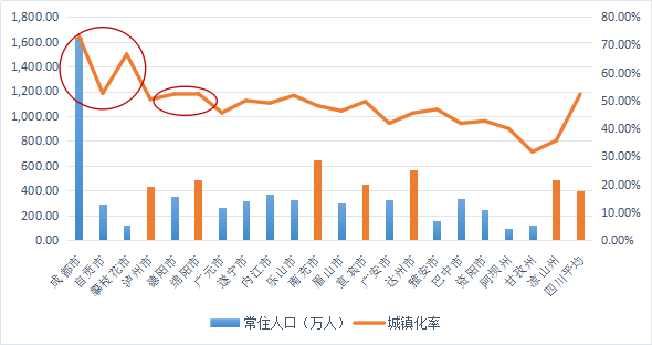 以常住人口与城镇化水平为例,除成都以外的常住人口超过平均水平的仅泸州、绵阳、南充、宜宾、达州、凉山州6个,而城镇化率超过平均水平的仅自贡、攀枝花、德阳、绵阳4个。