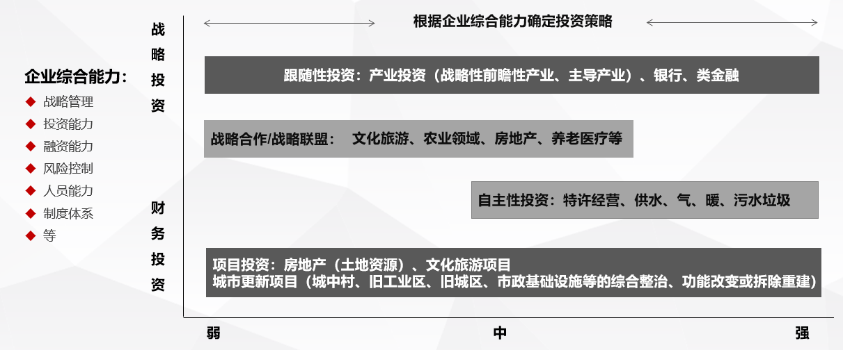 根据核心业务战略,确定财务性投资还是战略性投资。同时对于项目投资,根据城市发展阶段确定合适的投资项目类型。