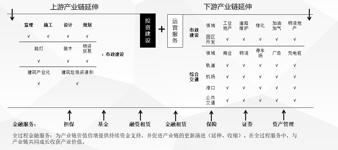 城投向下游二级产业链延伸,具备天然的垄断优势,如交通项目延伸出停车场和充电桩。对于产业链更新过程中的链条(业务)延伸和收缩,提出如下建议。
