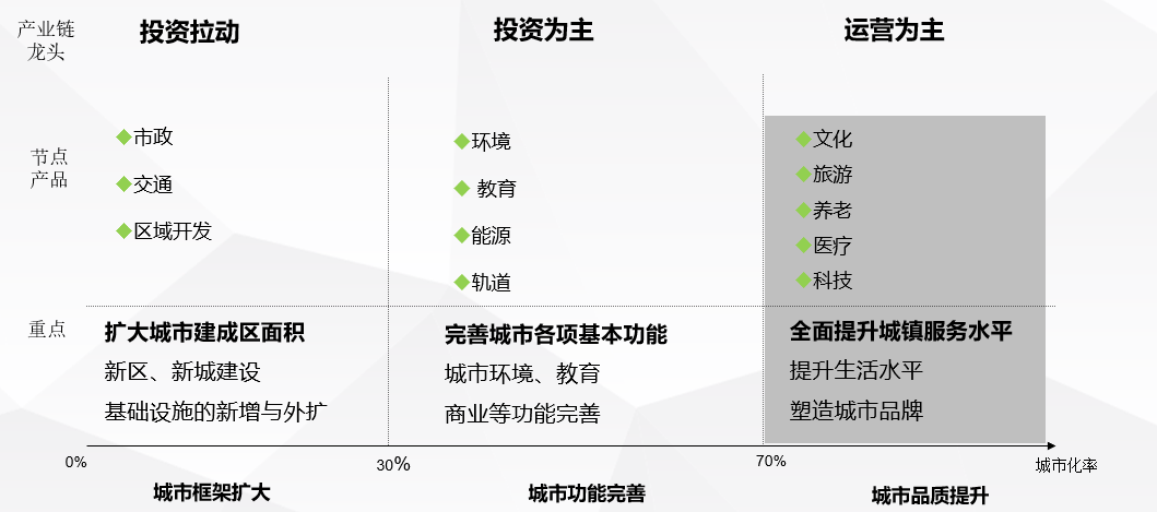 在城市框架扩大阶段以基础设施投资业务为主,至城市发展到功能完善阶段,需相应的调配资源至加强环境、教育、能源、轨道等产业发展上,着重完善城市各项功能。当城市发展至需提升城市品质阶段时,城市基建更新、文化、旅游、医疗、养老、科技等领域将成为产业发展的主赛道。