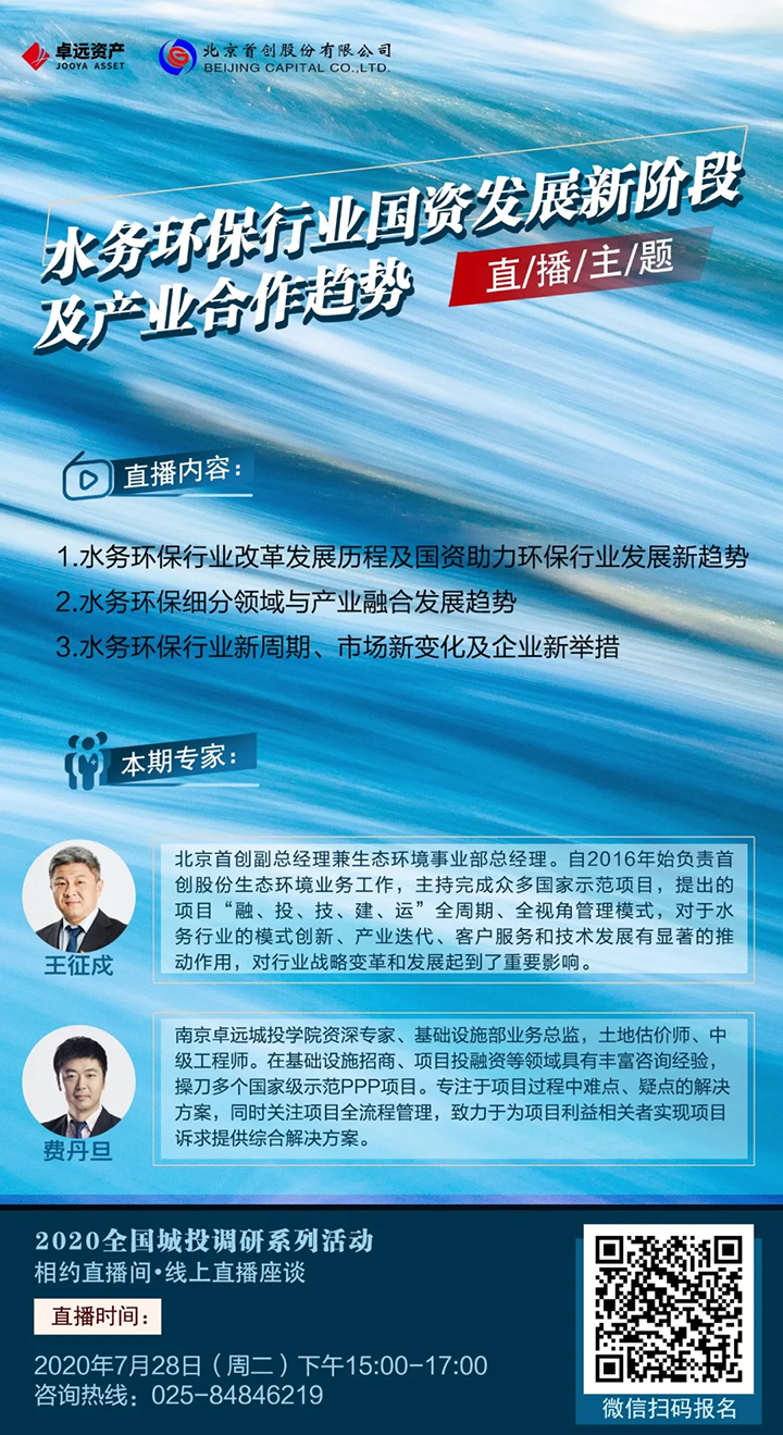 南京卓远第八期直播活动,以《水务环保行业国资发展新阶段及产业合作趋势》为主题,由南京卓远与北京首创股份有限公司联合主办,带您了解水务环保行业改革发展历程及国资助力环保行业发展新趋势,水务环保细分领域与产业融合发展趋势,水务环保行业新周期、市场新变化及企业新举措。欢迎广大城投企业参与直播间并展开互动,专家将为您答疑解惑。希望通过本次直播,解决难题、分享经验、共同交流、服务全国各地城投企业。