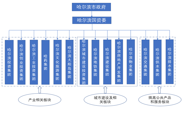 2019年8月,哈尔滨市发布《哈尔滨市属国有企业集团布局结构战略性调整工作方案》,将22家调整为14家,并为14家企业制定了各自的调整实施方案。通过调整,形成“产业相关板块”、“城市建设及相关产业板块”、“提供公共产品和服务板块”三大板块。