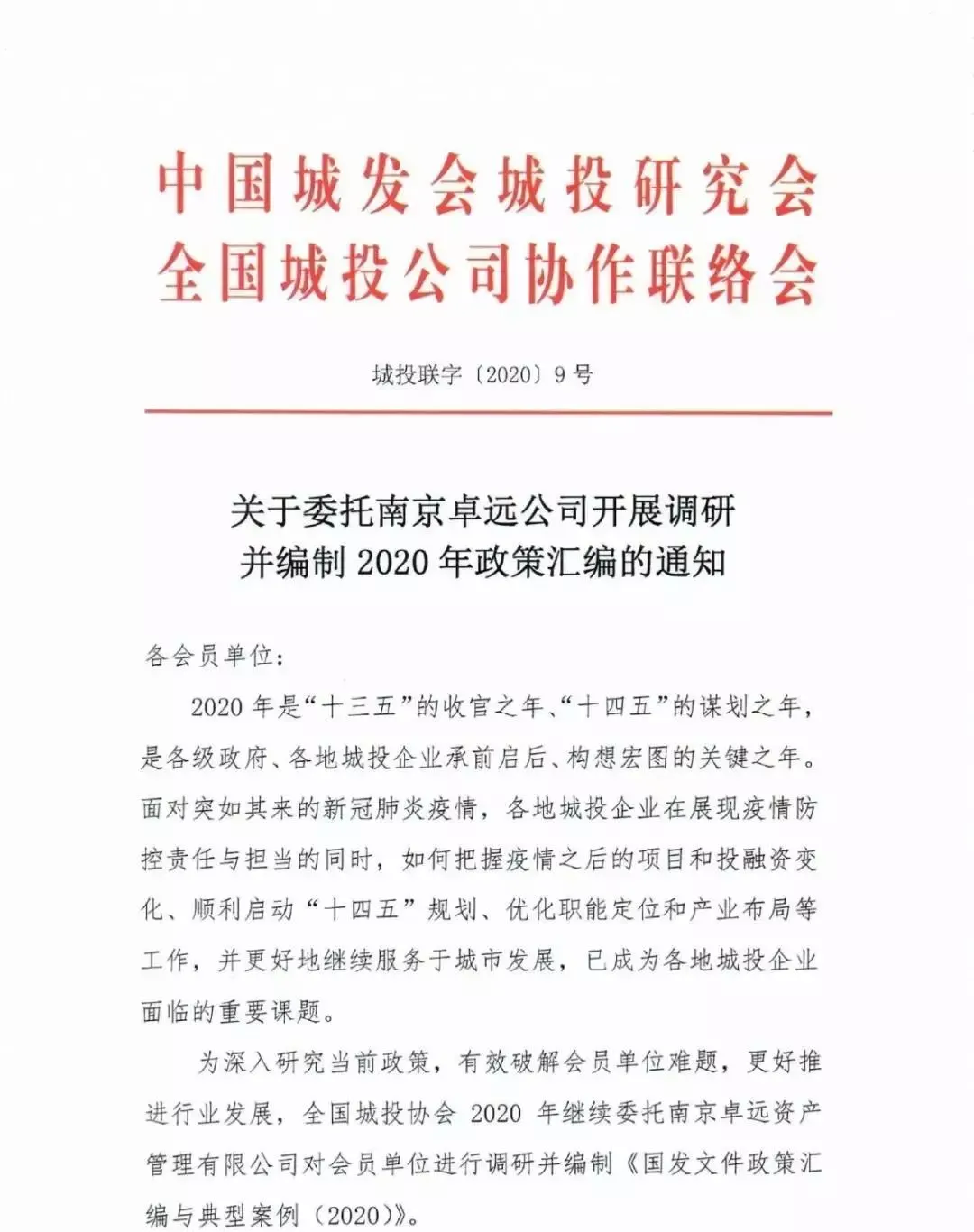 2020年是“十三五”的收官之年、“十四五”的谋划之年,是各级政府、各地城投企业承前启后、构想宏图的关键之年。为深入研究当前政策,有效破解城投单位难题,更好推动行业发展,全国城投协会2020年继续委托南京卓远公司对会员单位进行调研并编制《国发文件政策汇编与典型案例(2020)》。
