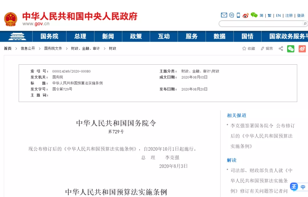 2020年8月3日,国务院总理李克强签署国务院令,公布修订后的《中华人民共和国预算法实施条例》,自2020年10月1日起施行。