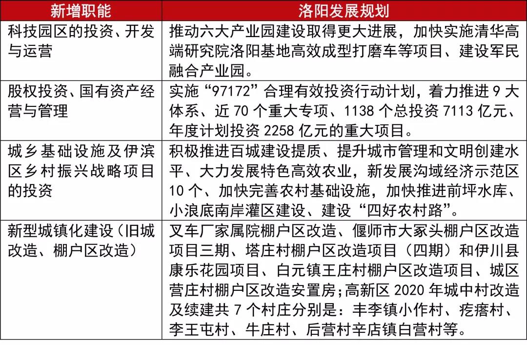 洛阳整体经济发展良好,2018年GDP增速增速高于全国、全省平均水平,洛阳城乡建设投资集团资产规模437亿,为进一步合理调整市国有经济布局,促进洛阳城乡建设投资集团有限公司健康发展,在保持现有集团公司职能的同时,增加国有资本投资运营的职能,转型为国有资本运营公司。经营范围与原来相比,增加“股权投资、新型城镇化建设。科技园区的投资、开发与运营、国有资产经营与管理、房地产开发经营、物业管理,房地产中介服务”等内容。