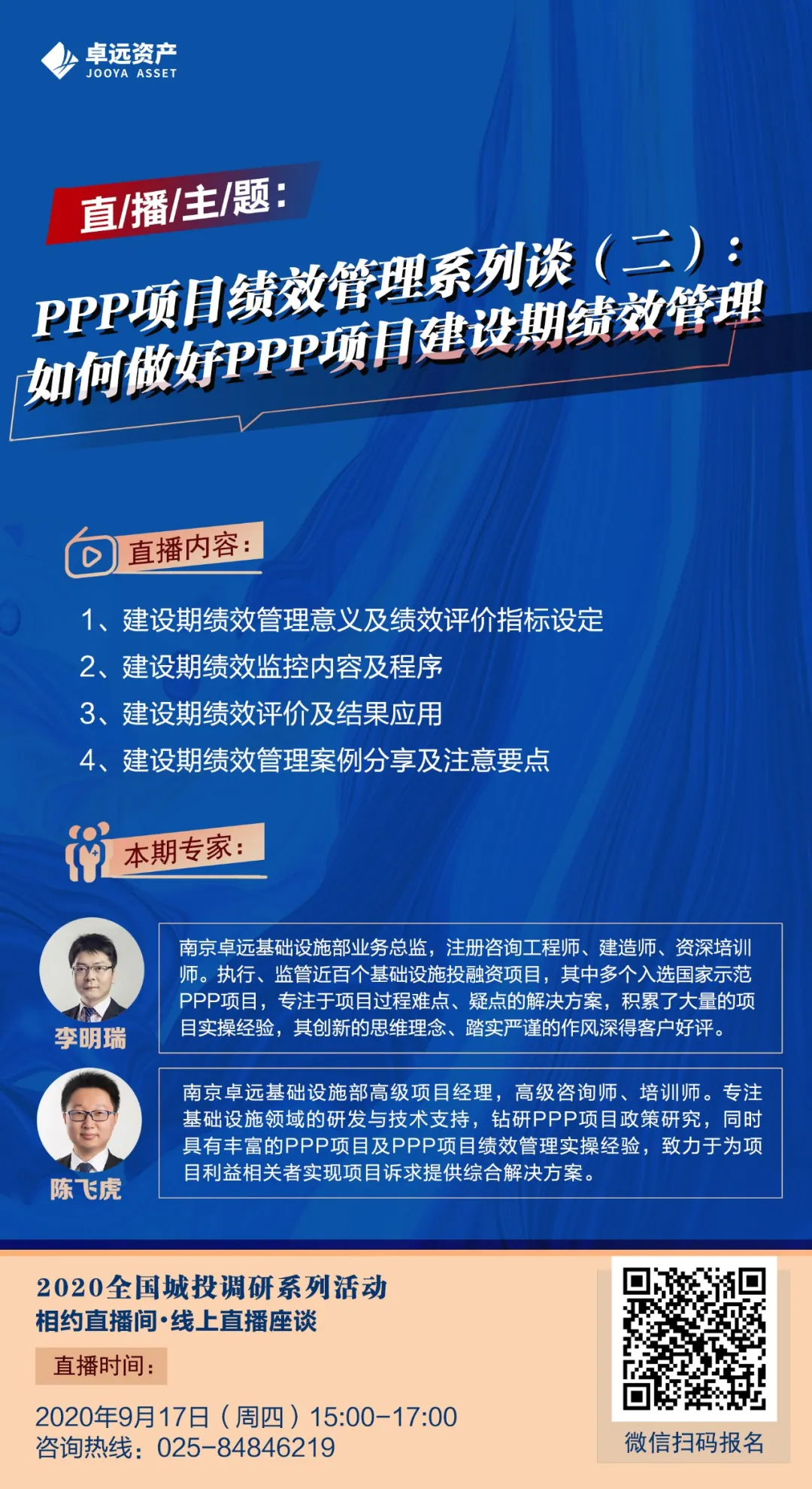 南京卓远第十二期直播,主题为《PPP项目绩效管理系列谈(二):如何做好PPP项目建设期绩效管理》。具体包括:为什么要做建设期绩效管理、建设期绩效管理内容是什么、如何做好建设期绩效管理等方面内容,旨在为大家更好理解建设期绩效管理工作的现实意义及顺利开展绩效评价工作。欢迎广大城投企业、政府财政及项目实施机构等职能部门、项目公司(SPV)积极参与直播间并展开互动,专家将进行答疑解惑。