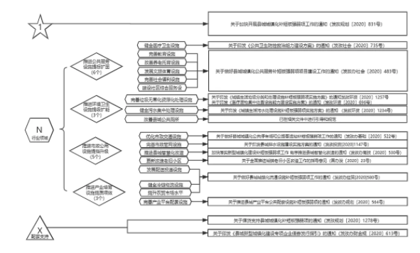 “1+N+X”系列文件包括“1”个核心文件、“N”个领域具体规范性意见、“X”个配套文件。其中“1”个核心文件是指2020年5月29日印发的《关于加快开展县城城镇化补短板强弱项工作的通知》(发改规划[2020]831号,以下简称“《通知》”),此后又围绕《通知》中4大领域17项建设任务发布“N”个领域具体的规范性意见文件,并提出了“X”个配套支持文件,具体如下表所示。