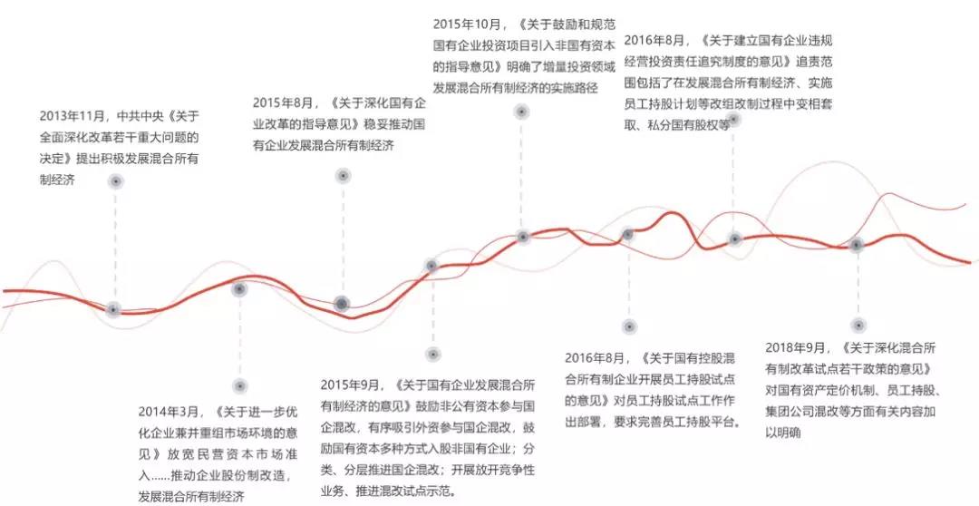 在混合所有制经济的完善阶段,尤其是2013年中共中央《关于全面深化改革若干重大问题的决定》开始,对推进国企改革、发展混合所有制经济达到前所未有的高度,形成了一些列政策文件(如图1所示),逐步明确了混合所有制改革的重要性,并对混合所有制改革的做法等做出了规范部署。