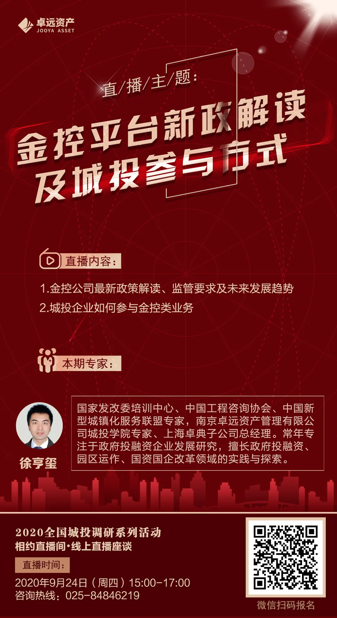南京卓远第十三期直播,由南京卓远推出主题为《金控平台新政解读及城投参与方式》,主要为大家解读金控公司的最新政策、监管要求及未来的发展趋势,并从实操层面为广大城投企业如何参与金控类业务提出相关建议。欢迎广大城投企业参与直播间并展开互动,专家将进行答疑解惑。