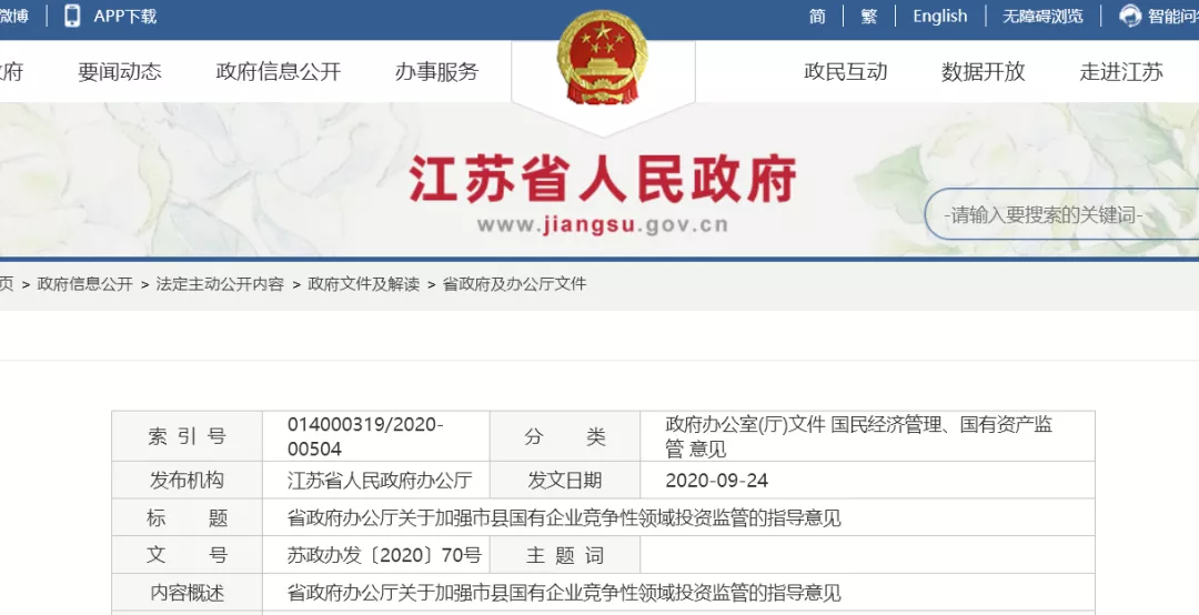 3、江苏省政府办公厅关于加强市县国有企业竞争性领域投资监管的指导意见