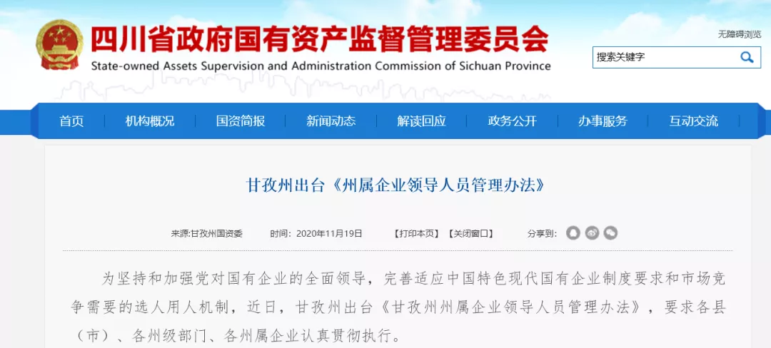 为坚持和加强党对国有企业的全面领导,完善适应中国特色现代国有企业制度要求和市场竞争需要的选人用人机制,近日,四川甘孜州出台《甘孜州州属企业领导人员管理办法》。《办法》共11章64条,分总则、职位设置、任职条件、选拔任用、考核评价、薪酬与激励、管理监督、培养锻炼、退出、市场化选聘、附则,明确了州属企业领导人员管理的基本原则、管理对象、主要内容和管理环节等。《办法》的出台,对持续深化甘孜州国资国企改革,提高州属企业领导人员管理工作质量,打造对党忠诚、勇于创新、治企有方、兴企有为、清正廉洁的州属企业领导人员队伍,做强做优做大国有资本,推动州属国企高质量发展具有十分重要的意义。