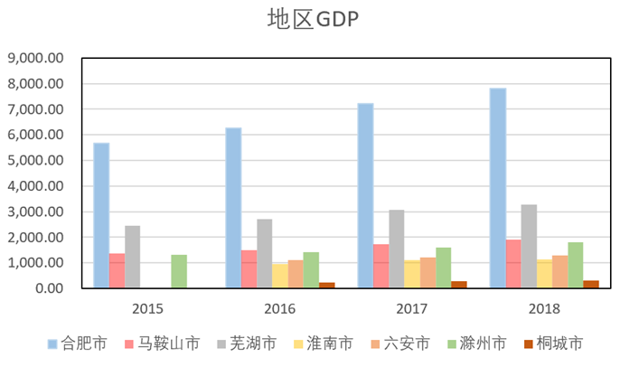 通过比较2015~2018年合肥都市圈内各市的经济生产总值,可以发现总的趋势是逐年递增的,在总量上,合肥以绝对优势领先于其他各地区,扮演着拉动周围地区经济增长的角色,芜湖市的表现也比较突出,马鞍山市和滁州市在数量比较接近,淮南市和六安市也比较接近。总体来说,影响合肥都市圈经济发展最关键的因素是地域之间发展不均衡,尤其是桐城市、淮南市和六安市发展比较落后。