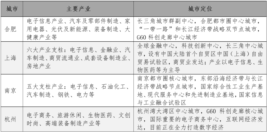 表1 长三角重要城市间产业与定位比较
