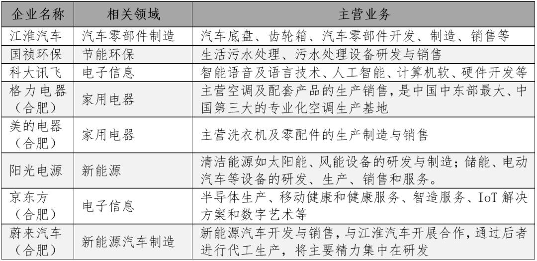 2019年末,安徽省内经过省科技厅认定的高新技术企业一共是6636家,其中合肥2549家,占比38.42%,行业覆盖了电子信息、汽车制造、人工智能、家用电器、新能源等领域;也有很多企业选择将产业基地建在合肥,包括:海尔、格力、美的、长虹、惠而浦等家电产业群;蔚来汽车、江淮汽车、大众汽车、长安汽车等(新能源)汽车产业集群;京东方、科大讯飞、中电科技等电子信息产业集群。