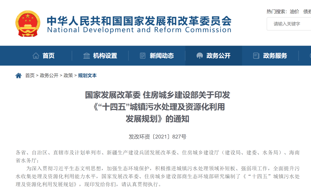 1、国家发展改革委 住房城乡建设部关于印发《“十四五”城镇污水处理及资源化利用发展规划》的通知