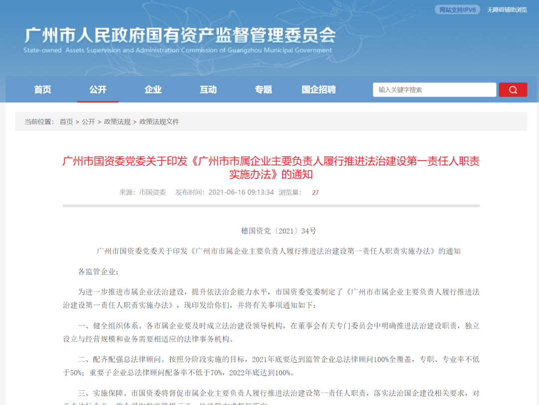 4、广州市国资委党委关于印发《广州市市属企业主要负责人履行推进法治建设第一责任人职责实施办法》的通知 |