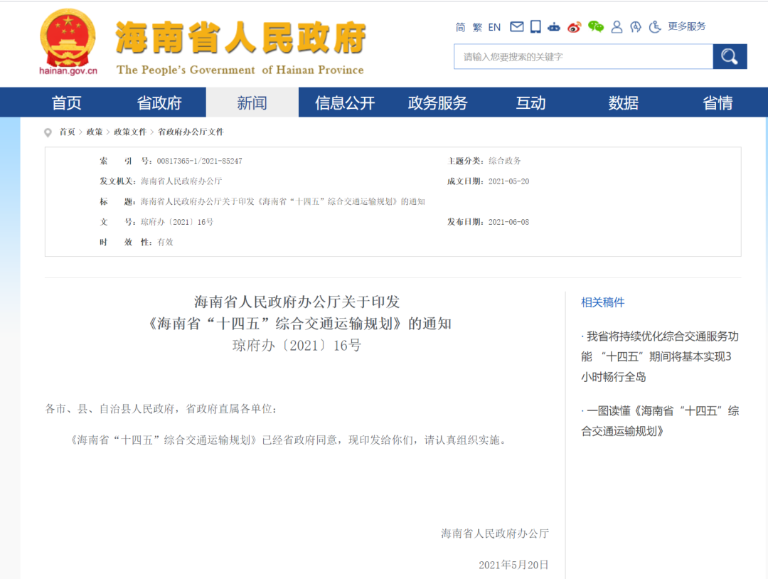 2021年6月8日,海南省人民政府办公厅印发《海南省“十四五”综合交通运输规划》。本规划确定“十四五”时期海南综合交通运输发展的总体目标、重点任务和政策方向,是指导“十四五”时期海南省综合交通运输发展的纲领性文件。