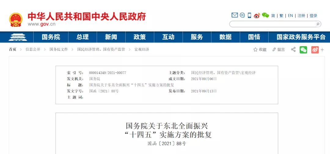 1、国务院关于东北全面振兴“十四五”实施方案的批复