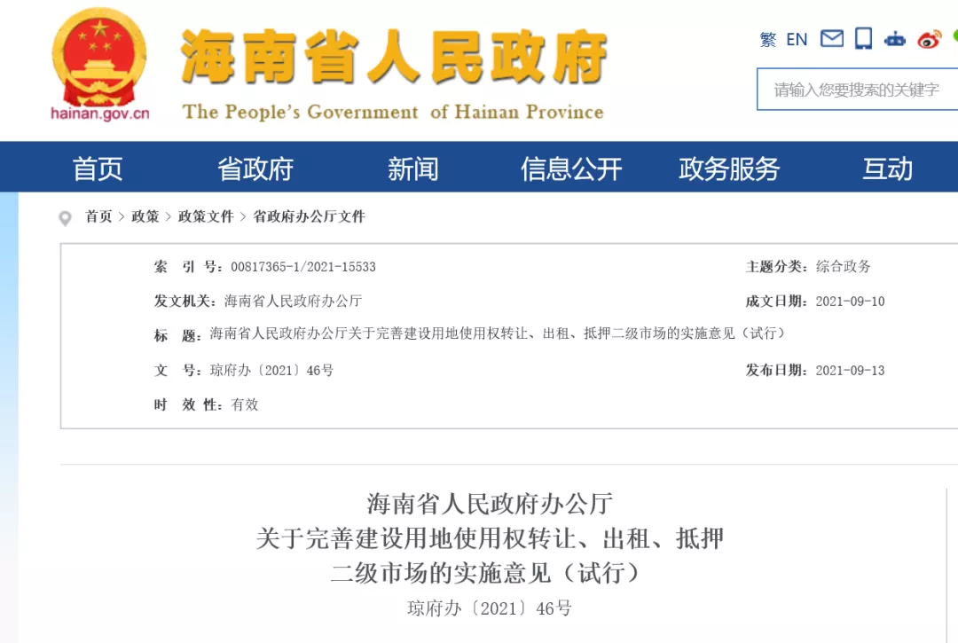 7、海南省人民政府办公厅关于完善建设用地使用权转让、出租、抵押二级市场的实施意见(试行) |
