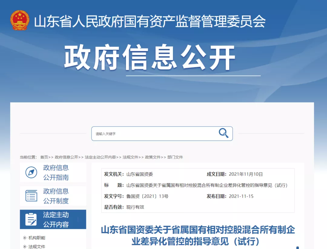 2、《山东省国资委关于省属国有相对控股混合所有制企业差异化管控的指导意见(试行)》