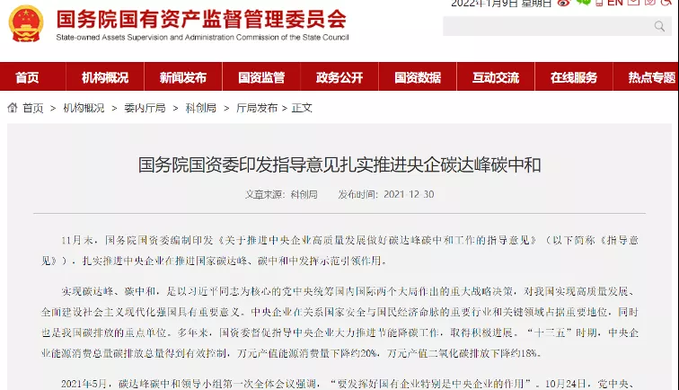 11月末,国务院国资委编制印发《关于推进中央企业高质量发展做好碳达峰碳中和工作的指导意见》(以下简称《指导意见》),扎实推进中央企业在推进国家碳达峰、碳中和中发挥示范引领作用。