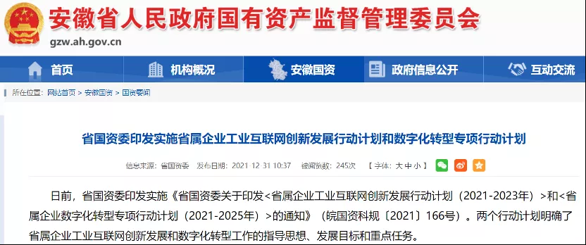 2、安徽省国资委印发实施省属企业工业互联网创新发展行动计划和数字化转型专项行动计划