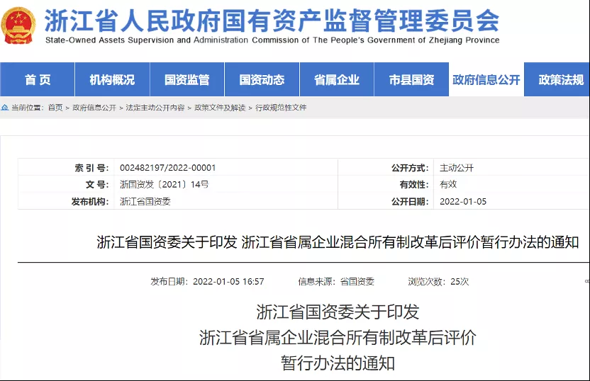 3、浙江省国资委关于印发 浙江省省属企业混合所有制改革后评价暂行办法的通知 |