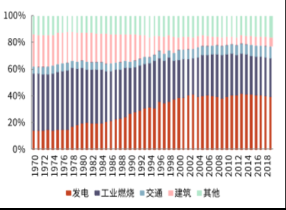 能源在“双碳”目标的实现中,占有举足轻重的地位。对碳排放的来源进行分析,在能源、工业等几个大的行业类别中,能源所占碳排放比例一直很高。能源的产生、转换、消费过程,包括驱动、产热等,都是温室气体排放的重要来源。对碳排用途进行细分,能源发电也成为碳排占比最多的部门。如下图,我国碳排放占比最多的部门从1970年起的工业燃烧逐步变为发电。2019年我国碳排放量115亿吨,其中发电碳排放量45.69亿吨CO2,占比40%;工业燃烧碳排放量33.12亿吨CO2,占比29%。因此,要实现“碳中和”,能源转型迫在眉睫。