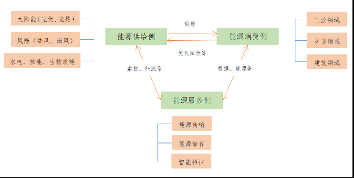 能源供给侧为消费侧进行供能,消费侧为供给侧提供优化回馈等,供给侧和消费侧共同为服务侧提供相应数据和能源,服务侧为供给侧和消费侧提供配套设施和精准调配等服务。