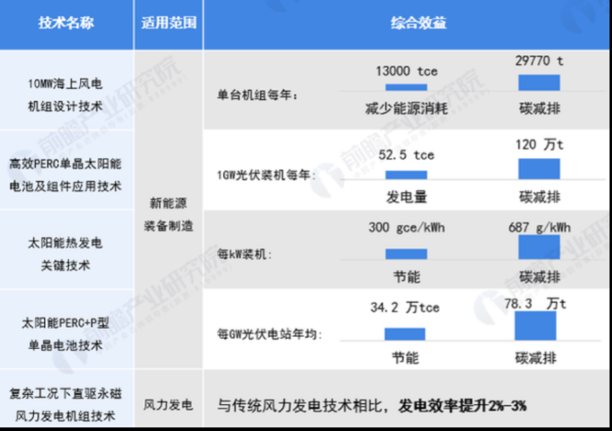 在新能源开发方面,太阳能、风能发电是发展重点。《“十四五”到2035中国新能源产业发展愿景报告》提出,我国技术上可开发的风能和太阳能潜力巨大,无论东部还是西部,都可以满足在我国实现“碳中和”的需要。根据《绿色技术推广目录(2020年)》及相关规划,风能、太阳能发电技术也是新能源发电技术的发展重点。其中,有2项风电技术入选《目录》,有3项太阳能发电技术入选《目录》,每项技术的节能、碳减排效益如下:
