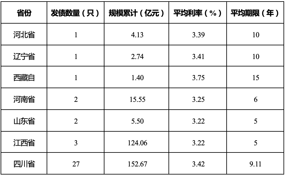 全国首单乡村振兴专项债为2018年8月20日四川省人民政府发行2018年四川省泸县乡村振兴专项债券,而四川省目前也是我国乡村振兴专项债发行数量、发行金额最多的省份。根据中国地方政府债券信息公开平台披露信息,目前共有7个省份累计发行乡村振兴专项债37只,发行规模合计306.04亿元,发行期限多在5~10年,发行利率在2.8%~3.9%之间。在7个省份中,四川省共计发行27只,规模152.67亿元,发行数量与金额均最多;江西省尽管只有3只,但规模达到124.06亿元。募集资金投向包括农产品生产基地建设,农业产业园区、产业强镇建设,高标准农田建设,水库移民,土地复垦,水利建设,乡村公路,特色小镇等诸多方面。
