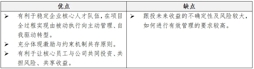 项目收益分红作为中长期期激励的一种,其激励作用相对于其他激励方式,短时间内即可显现,实施方式主要以项目为主体,用于激励项目相关的关键人员,科研项目收益分红是“以科技成果转化收益为标的,采取项目收益分红方式”。激励对象针对性强。项目收益分红的激励来源是项目的增量收益,因此国有资产流失风险小。但是科技成果是企业内部共享的科研产出,其净收入的计算方式是难点,分配比例等不易敲定,实施难度稍大,部分项目收益所需时间周期长,具有不确定性,不利于激励方案设计基础较为薄弱的企业。