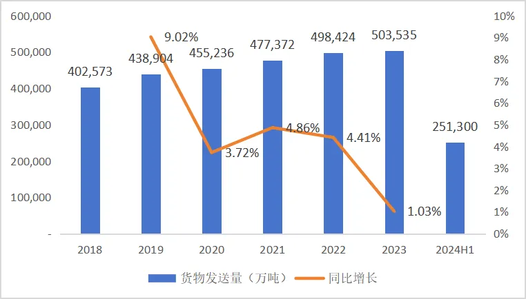 自2018年中央财经委员会第一次会议明确提出调整运输结构、增加铁路运输量以来,国家及地方陆续发布补助及引导性政策,我国铁路货物运量持续提升,截至2023年末已达50.35亿吨,约占整体货运量的9.2%。铁路货运量经过这几年的挖潜提效,整体呈现增量收紧的态势,行业转向存量市场竞争的特征逐渐显现,但随着我国铁路货运相关政策影响进一步释放,铁路货运行业仍保有一定的增量潜力。如《有效降低全社会物流成本行动方案》中提出,“到2027年我国货物运输结构进一步优化,铁路货运量、铁路货运周转量占比力争分别提高至11%、23%左右”的目标。