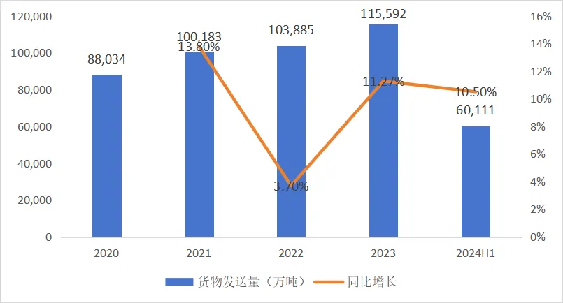 全国铁路货运形势逐渐低迷主要受国家铁路货运量影响。中国国家铁路集团有限公司(以下简称“国铁集团”)数据显示,2024上半年国家铁路货运总发送量19.23亿吨,同比下降0.4%。而与国家铁路货运量形成鲜明对比的是,地方铁路货运量正凭借更具针对性的政策支持、更加灵活的服务实现逆势增长,有望成为铁路货运行业新增长极。中国地方铁路协会数据显示,2020-2023年间,地方铁路货物发送量提升了31.30%,2024年上半年地方铁路货物发送量6.01亿吨,同比增长高达10.50%。同时,地方铁路货运量占全国铁路货运量比例也在不断提升。2024年前6月地方铁路货物发送量占全国铁路货运总发送量的23.92%。而2023年和2022年同期,这个比例分别为21.78%和20.71%。