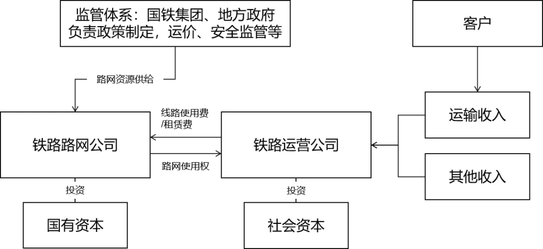铁路公司的“网运分离”是指将自然垄断领域的路网资产经营与竞争性领域的运输服务相分离,分别成立“铁路路网公司”和“铁路运输公司”。其中铁路路网公司负责路网的投资、建设、维护以及调度,但不负责运营,而是通过竞争方式像运营公司提供路网使用权;铁路运营企业则作为自主经营、自负盈亏的市场化公司,通过租用铁路线路向客户提供不同的物流及配套服务,支付线路资产使用费或租赁费,并可在业务能力建设完善和资源允许情况下,进一步参与市场竞争受托管理运营其他省市的铁路线路。