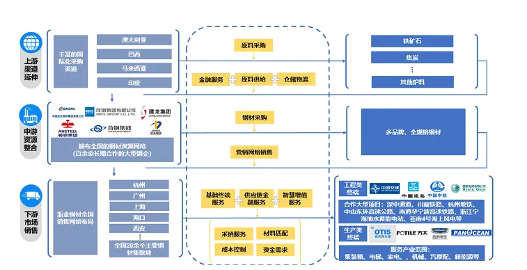 供应链物流业务的成熟形态可参考浙江物产中大集团(以下简称“物产中大集团”)的钢铁全产业链贸易物流。物产中大集团从国际化渠道采购铁矿石、煤炭等原材料并将产品售往中游的宝武集团、鞍钢集团、河钢集团等大中型钢厂,并建立起遍布全国的钢材资源网络,在此流程中,物产中大集团还提供相关仓储物流和配套金融服务;在中游完成钢材生产后,物产中大集团收购钢材并依靠自身营销网络售为中交、中冶、中建等核心优质客户提供原材料组织、材料保供、成本管理、物流规划和金融服务等配供配送基础需求,另外物产中大集团还与浙江省内外的集装箱、电梯、家电、汽摩配、新能源等若干特色产业集群建立长期配送服务关系,为大型产业客户及终端产业集群在资源组织、成本控制、库存风险等方面提供一揽子解决方案。