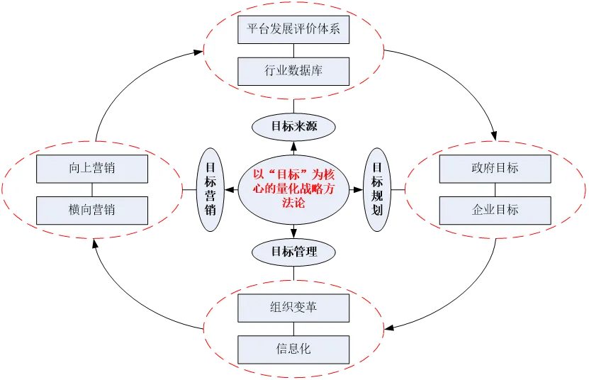 该方法论的核心在于以“目标”为导向,通过四个“结合”:目标来源——平台发展评价体系与行业数据库相结合、目标规划——政府目标与企业目标相结合、目标管理——组织变革与信息化相结合、目标营销——纵向营销与横向营销相结合,分别用于战略分析、战略制定、战略实施与反馈、战略支撑体系,为城市国企构建全面、系统且具有可操作性的战略体系。