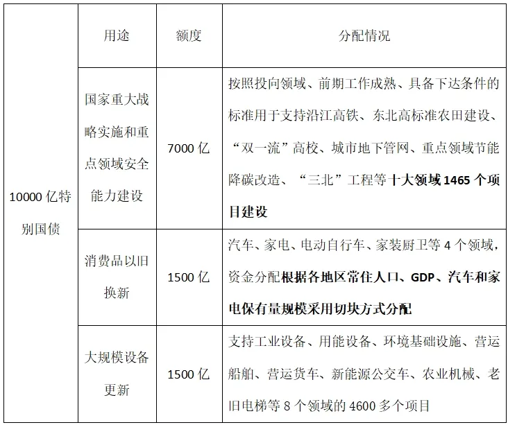 2024年发行了10000亿的特别国债,考虑到2023年底按照特别国债管理的10000亿元增发国债中有5000亿元结转到今年使用,今年用于两重两新的特别国债资金已达15000亿元。